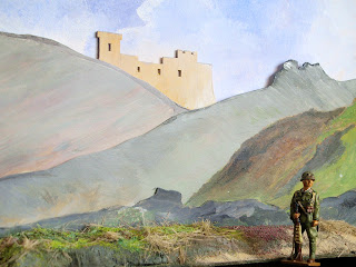 The Hill Fort and Mountain Diorama was inspired by Afghanistan and the Khyber Pass region. The castle walls were Ancient stone work and flaking plaster  while the town scape was a typical desert village.